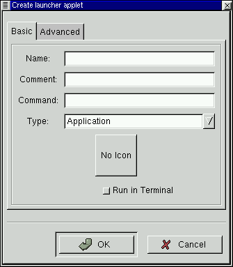 In the Create launcher applet dialog you may add a name for your launcher, a comment, the command line to launch the application, and define the application type. You may also press the icon button and choose an icon to represent the application from the icon picker. If no icon is chosen a default icon will be used.