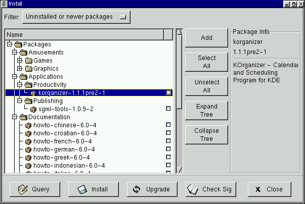 Gnome-RPM provides you with a choice of package views (as shown in Figure 6-3). You can filter your views for