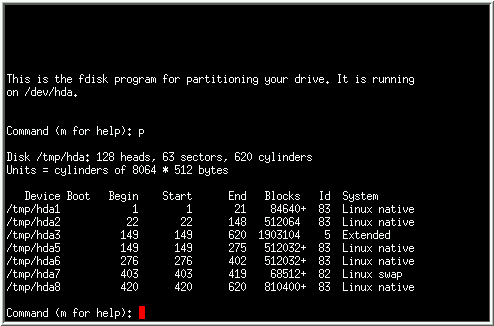 To list the current partition table, use the p command (see Figure 8-20).